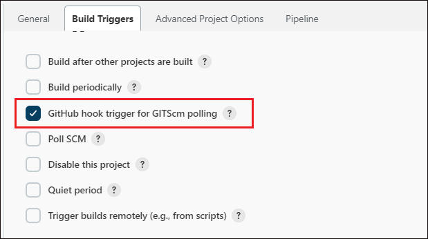 Login to your Jenkins portal, open your pipeline, and scroll down until you find Build Triggers option. Select the option for GitHub hook trigger for GITScm polling.