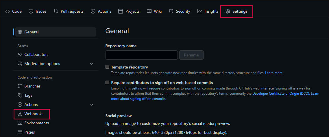 After you create the file, goto GitHub repository settings and click on webhooks option as shown below.